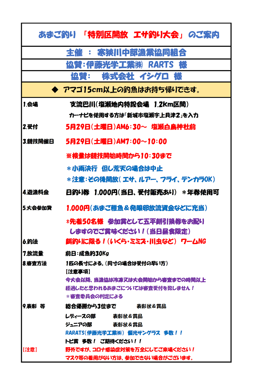 令和3年5月29日寒狭川支流巴川(塩瀬地内)であまご釣り大会を開催します。当日はエサ釣り限定で、15cm以上のアマゴは持ち帰りできます。